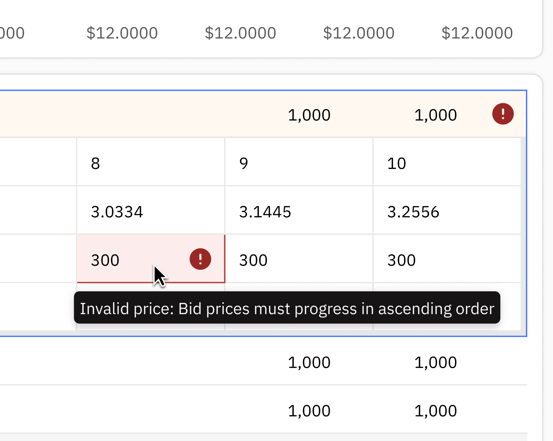 Upfront validation handlingInbuilt grid validations flag after trader input, reducing likelihood of having rejected bids.